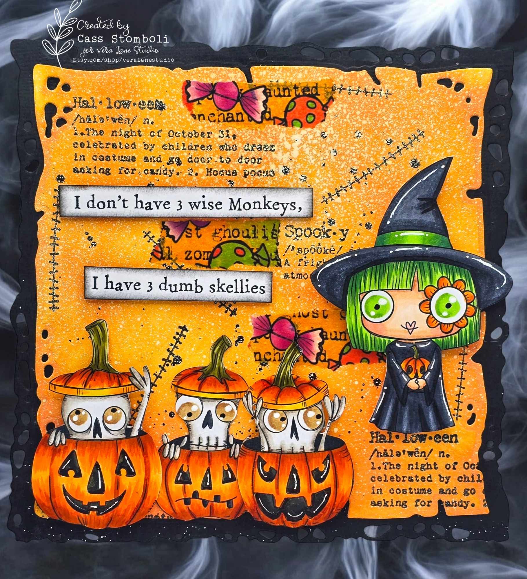 Bring some spooky cuteness to your paper crafting with Gourgous - 6 Digi stamps. These three goofy skeletons peering out of jack-o'-lanterns are perfect for Halloween or anytime. With three included sentiments, get ready for plenty of fun creating with these exclusive characters in both jpg and png files.